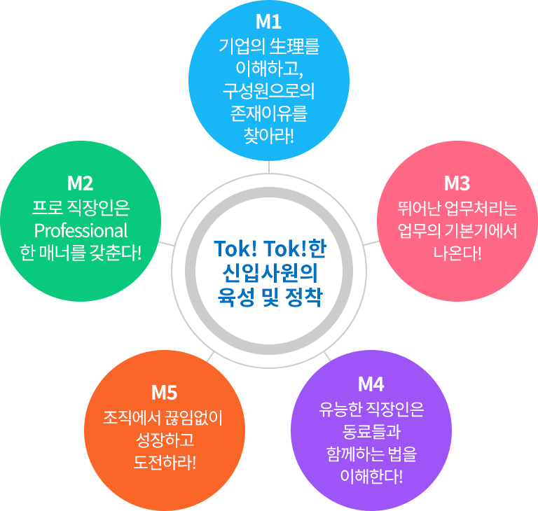 <Tok!Tok!한 신입사원 입문교육>은 신입사원들이 조직에 빠르게 적응할 수 있도록 개인과 회사의 비전을 인식시키고, 직장인으로서 지녀야 할 기본적인 역량을 배양하는 과정입니다.