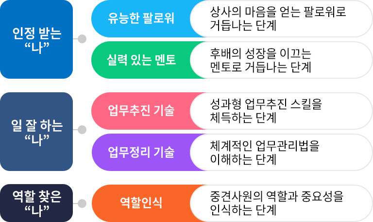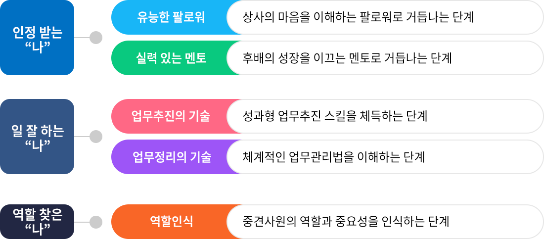 <“Reach Higher” 중견사원 과정>에서는 중견사원으로의 모습을 정립하여 업무의 전문성을 높이고, 상사와 후배에게 발휘해야 하는 역량을 습득해가는 과정입니다.