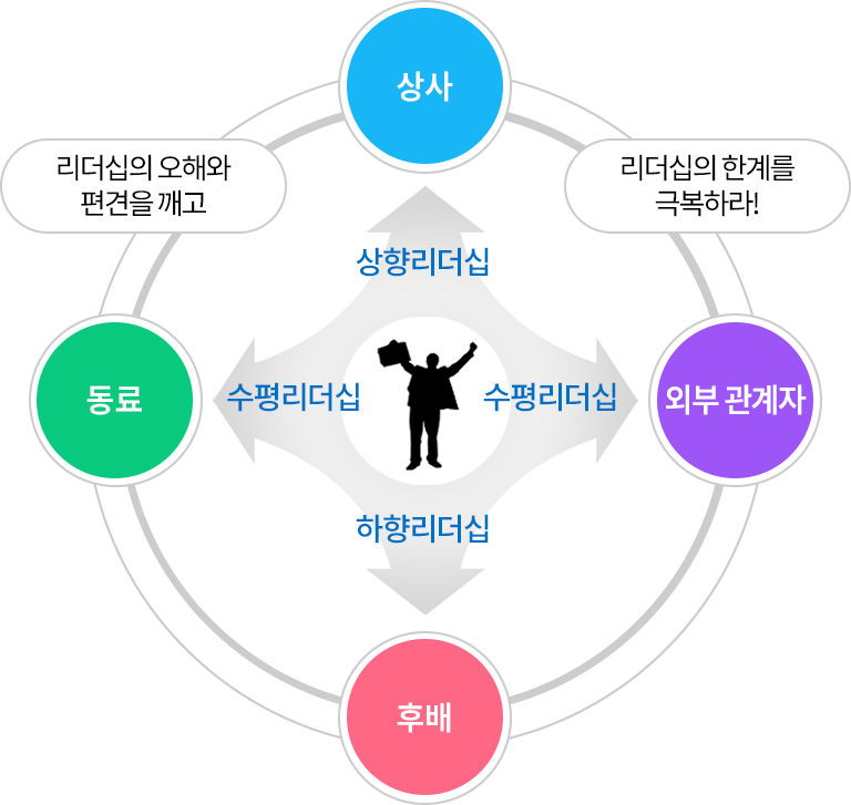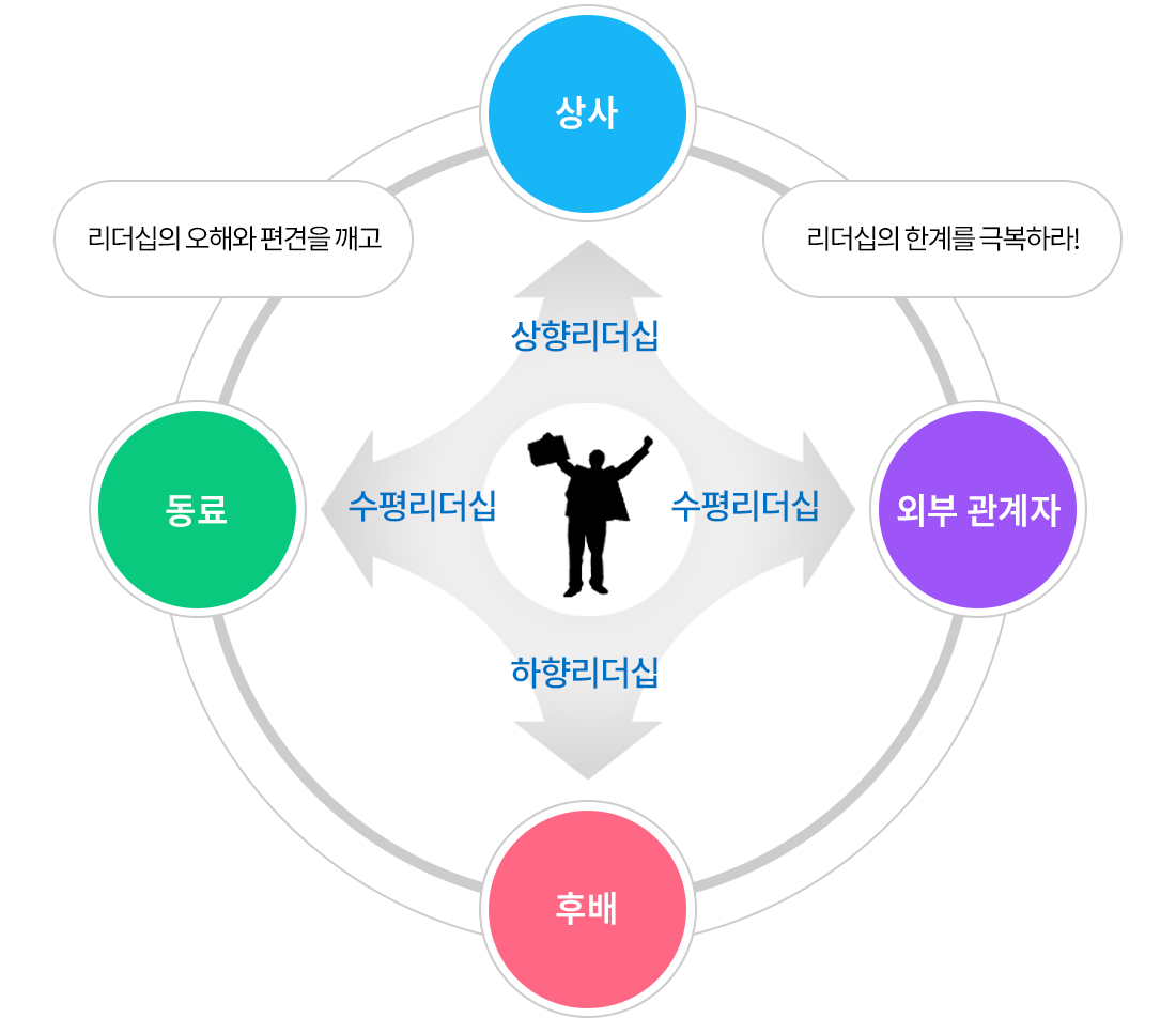 360도 리더십의 진정한 의미는, 지위에 의해 발휘되는 것이 아닌 모든 구성원들의 역할에 따라 리더십이 발휘될 수 있음을 깨우치는 것에서부터 시작됩니다.
