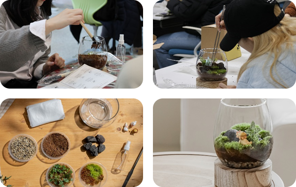 특징 : 나만의 개성을 담아 테라리움을 만들어가며 모든 작품이 완성되면 관리법과 유의사항에 대한 안내해드리는 프로그램입니다.